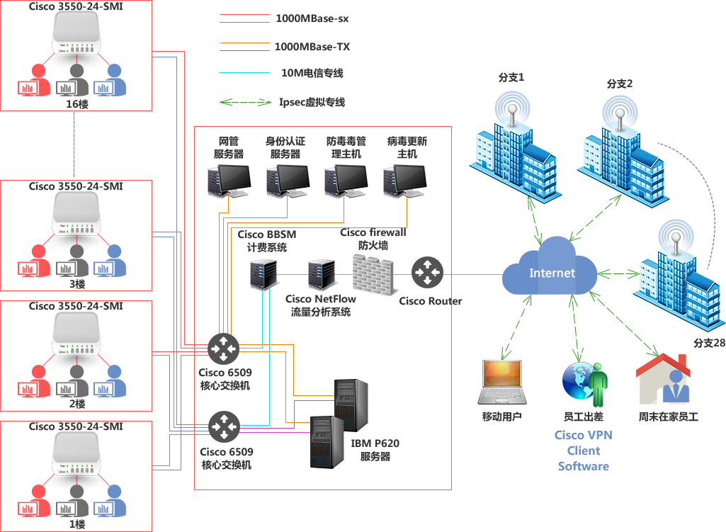 CISCO交换机、网管系统、防火墙、计费网关,SYMANTEC防病毒软件等。