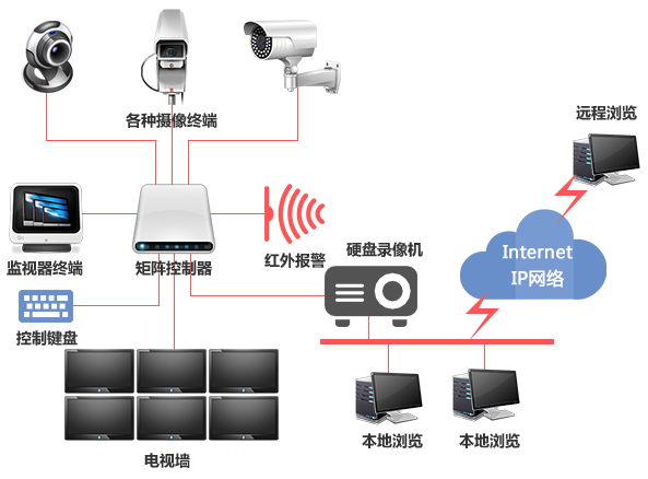 摄像枪,矩阵控制器、键盘(可选),红外报警(可选),画面分割器(可选)显示终端,硬盘录像机、管理软件等。