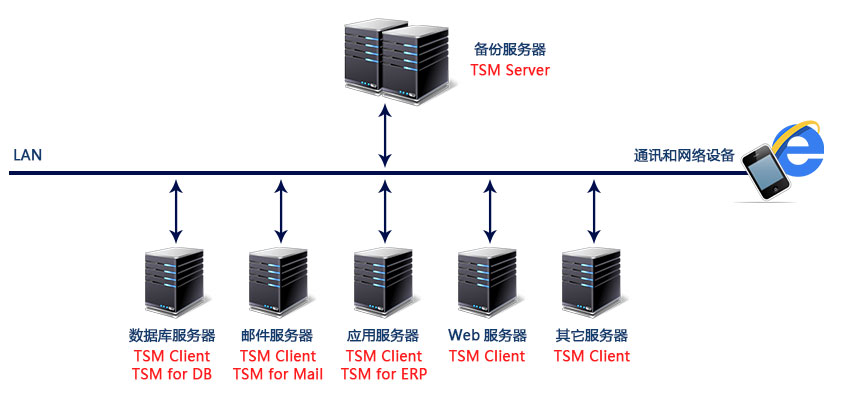 IBM TSM使用的是IP协议,因此IBM TSM理论上可以安装在局域网的任何地方。但是考虑到备份性能的因素,我们建议将备份服务器安装在连接所有主服务器的主交换机上。用于存储的磁带库通过光纤和备份服务器相连
