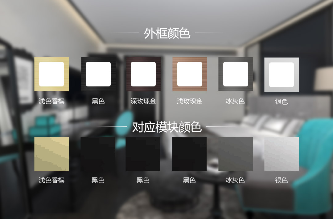 个性定制房间开关插座,根据酒店客房风格按需定制颜色,款式,材质等等,满足酒店时尚个性的用户体验